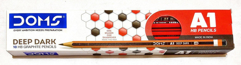 Attribute Details Brand Doms Quantity As per pack (standard retail pack) Type / Material Wooden pencil with deep dark graphite lead Shelf Life Not Applicable Maximum Retail Price As per manufacturer Country of Origin India Storage Instructions Store in a cool, dry place Special Notes Non-toxic, safe for students